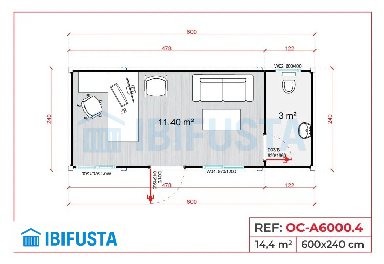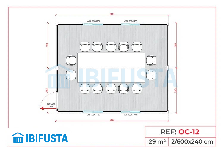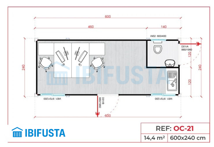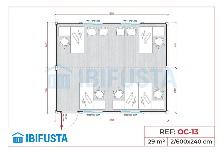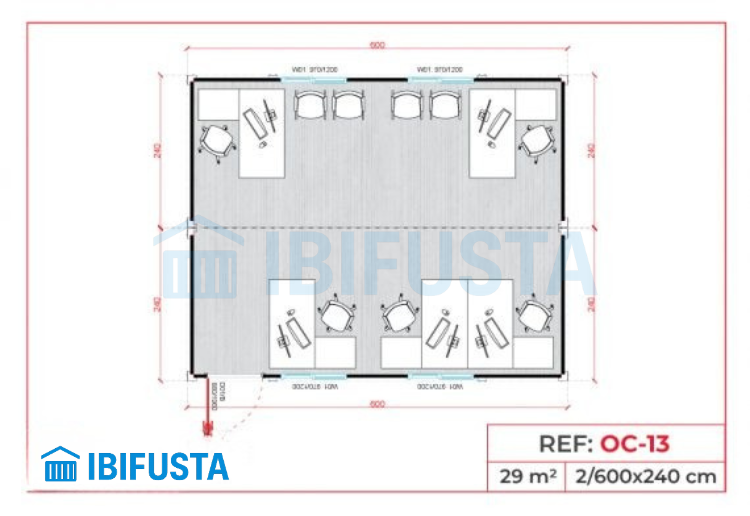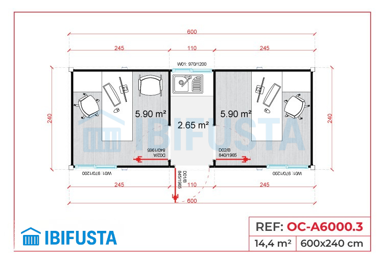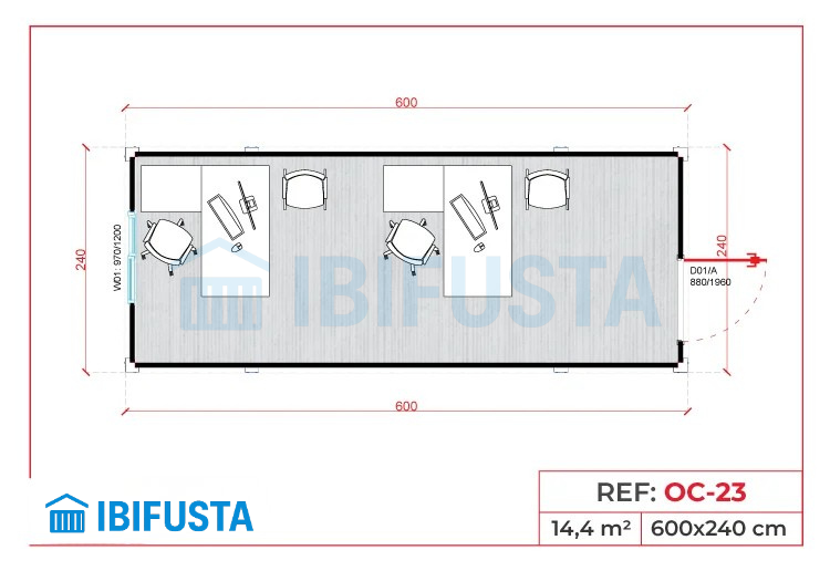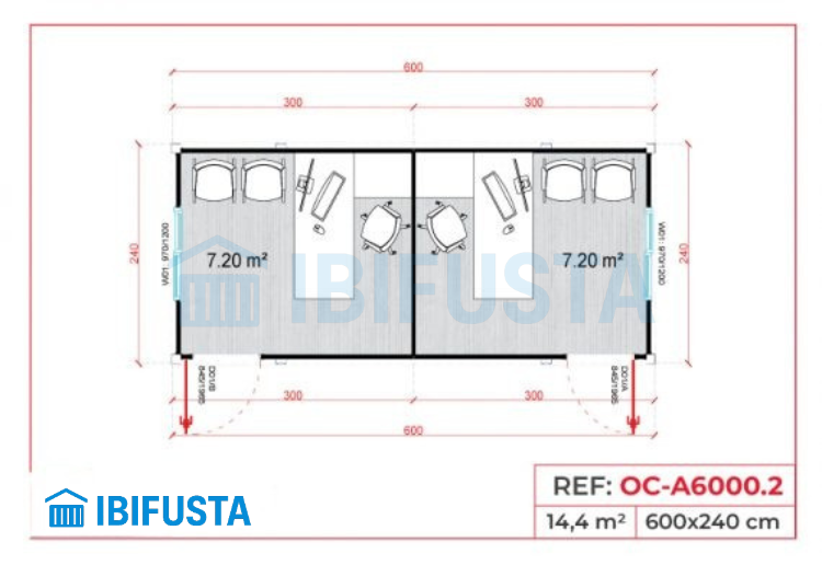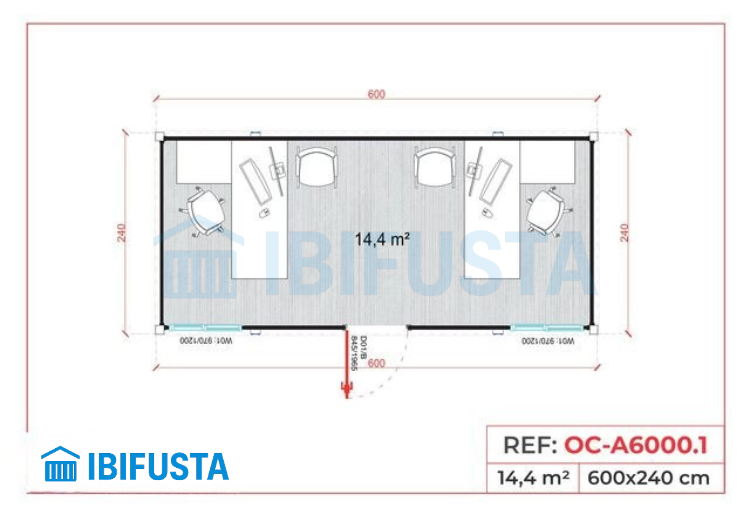 OC-A6000.1 → Oficina compacta de 6,00 × 2,40 m con dos puestos de trabajo, ideal para obras o supervisión de campo.
