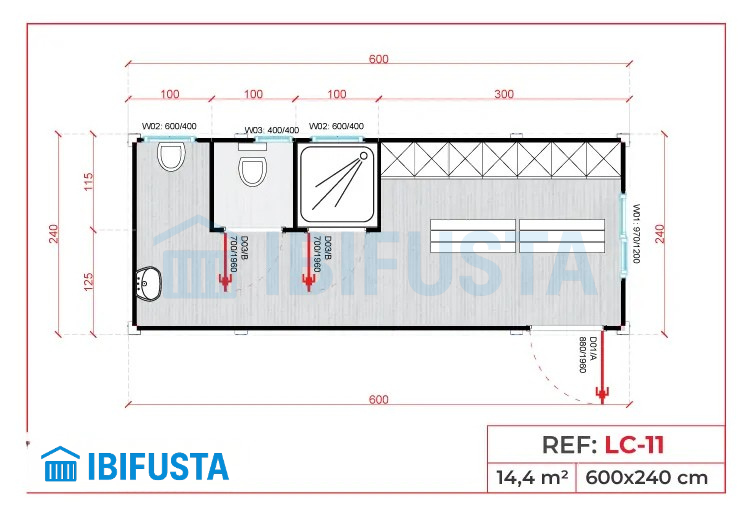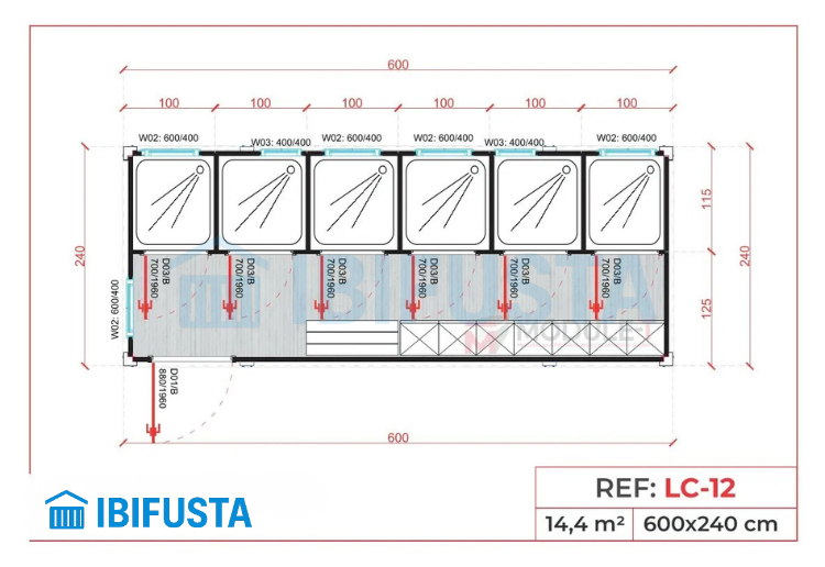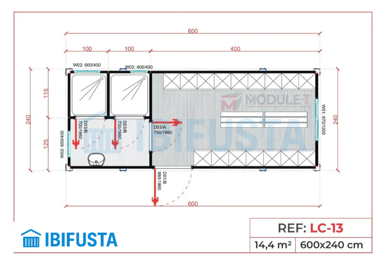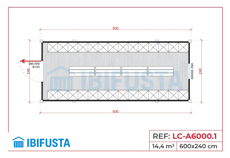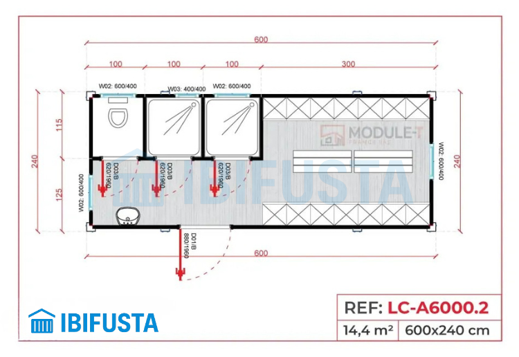 LC-A6000.1 → módulo de 14,40m2 con cabina doble, bancos y ventilación.