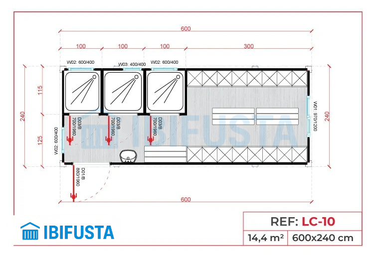 LC-10 → módulo con bancos, cabinas, ventilación, tres duchas y lavamanos.
